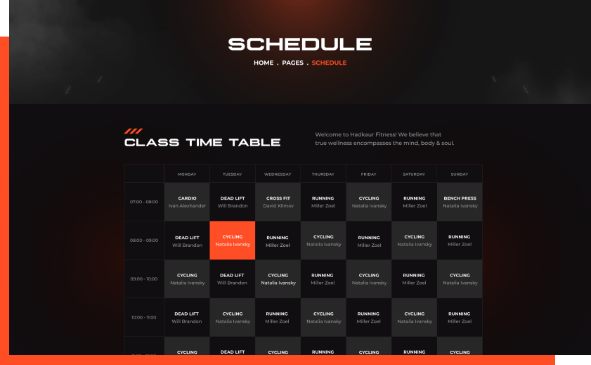 To provide a complete exposer to the users website, we provided 2 designs of class schedule routine. Which includes the week days, class name along with instructor details.
